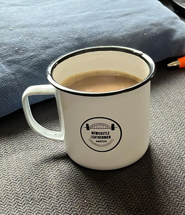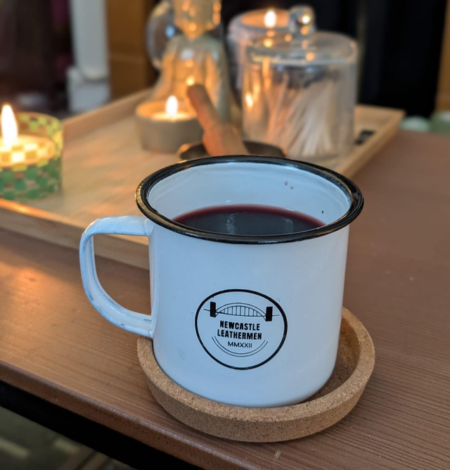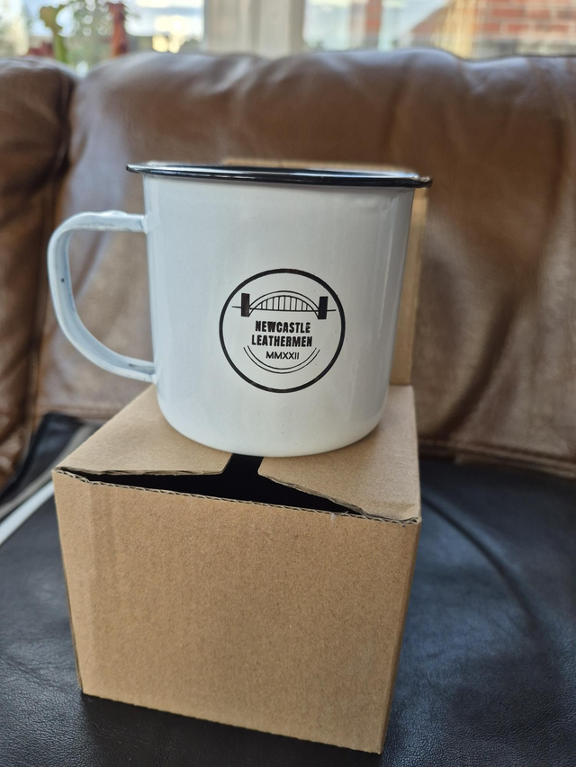 White tin mug with logo laser etched onto the front, each mug has unique finishing, no two are the same.